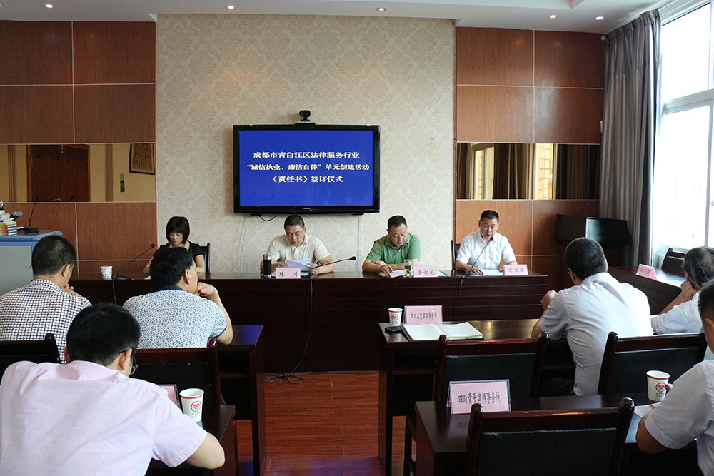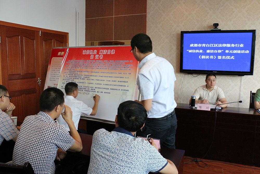 为全面培养律师廉洁诚信的执业风尚,大力弘扬律师传统精神和执业道德,进一步加强行业自律,促进律师廉洁从业、诚信执业。成都市青白江区法律服务行业“诚信执业、廉洁自律”单元创建活动动员大会于2015年7月17日在区司法局会议室召开。该项活动围绕加强理想信念教育,在律师行业深入开展社会主义法治理念教育、执业道德教育和廉洁诚信示范教育、警示教育,确保律师工作正确的政治方向。到会人员在倡议书上签名,四川志宽律师事务所主任陈志宽代表全区律师、法律工作者、公证员在大会作表态发言:坚持依法执业、诚信执业、规范执业、廉洁自律。