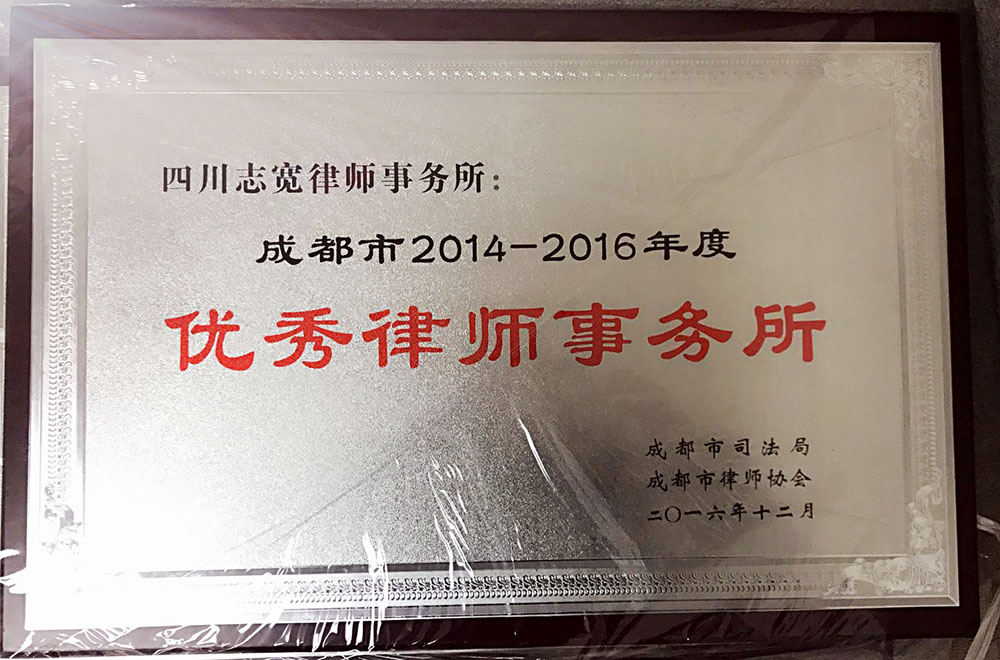 四川志宽律师事务所荣获“成都市2014-2016年度优秀律师事务所”荣誉称号。
